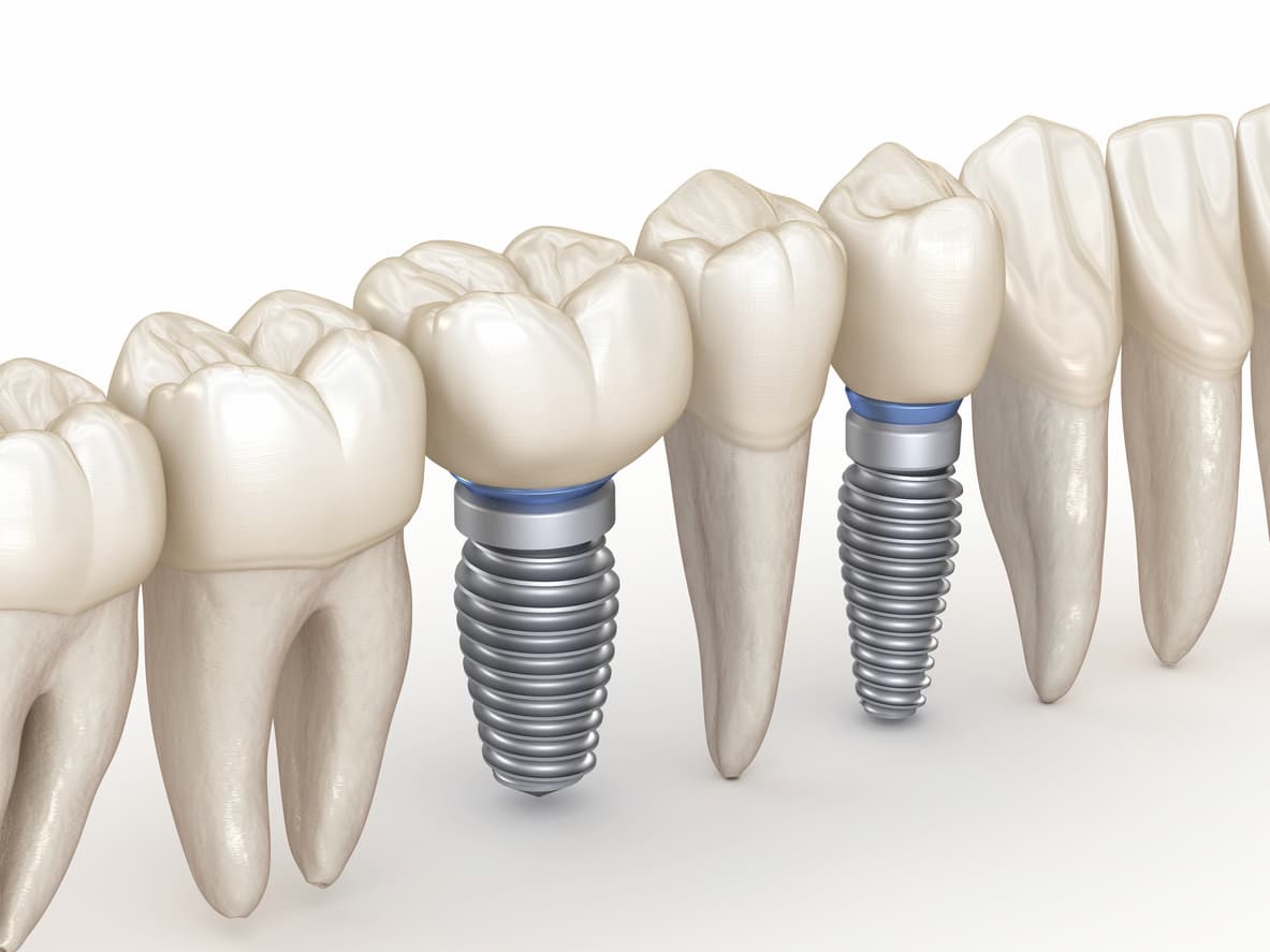 Dental implants are synthetic structures that are placed in the area of the tooth normally occupied by the tooth root. They are anchored to the jawbone with a titanium post called an abutment, that fuses to the jawbone and acts as a foundation for an artificial tooth or permanent bridge. In some cases, implants can be used to attach dentures.